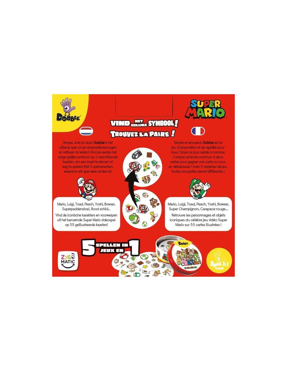 Retrouvez tous les personnages et symboles de la saga Nintendo Super Mario : Mario, Luigi, la Princesse Peach, Browser, Yoshi, etc. Dobble est un jeu testant votre rapidité et votre sens de l'observation. Le but est simple : etre le premier a trouver le dessin identique entre deux cartes.