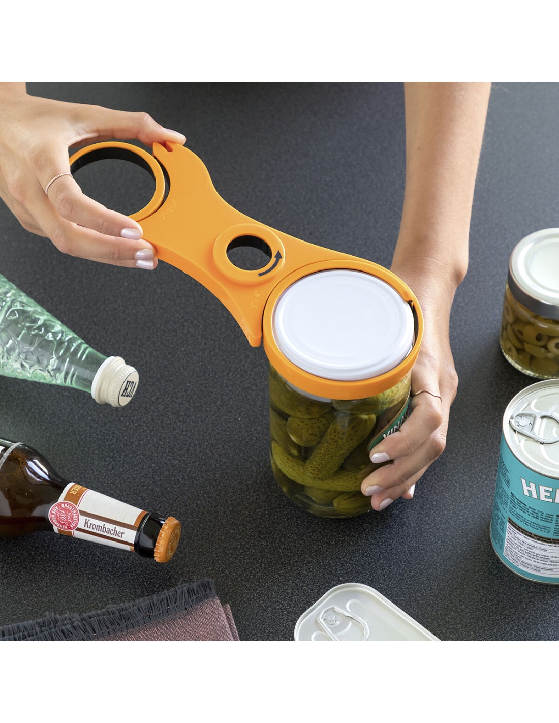 Très commode et pratique pour ouvrir des bocaux, des bouteilles et des boîtes rapidement et facilement, sans aucun effort. Un seul ustensile avec plusieurs fonctions, qui aide à maintenir de l'ordre et à gagner de la place dans la cuisine.